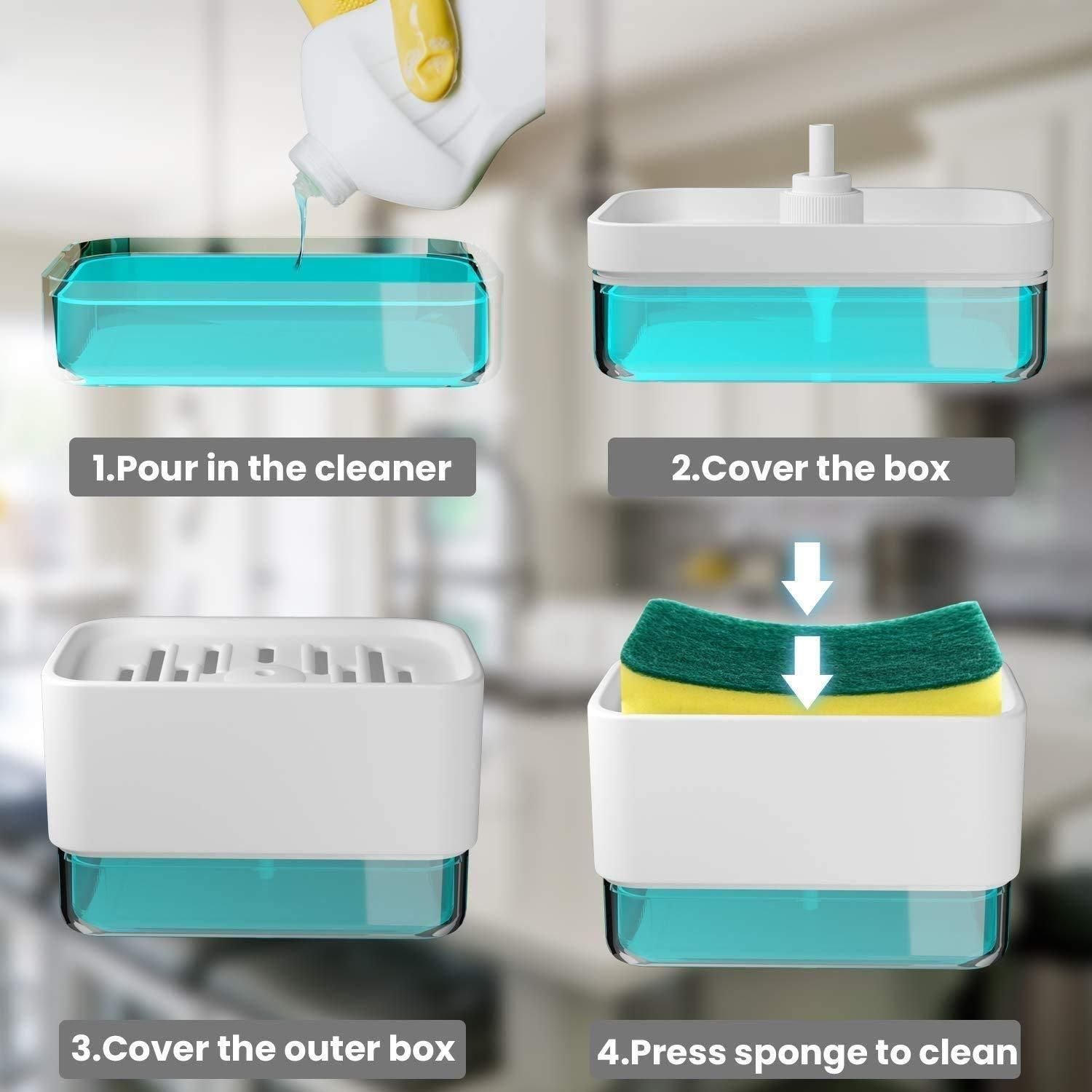 Product Name: Liquid Soap Dispenser with Sponge Holder for Kitchen Sink Package Contains: It has 1 Dispenser Material: Plastic Color: Colour as per availability Capacity: 400 ml Combo/Set Of: Pack of 1 Additional Information: 2 IN 1 SOAP DISPENSER & SPONGE HOLDER : UNBREAKABLE ABS PLASTIC RUST PROOF MATERIAL TRANSPARENT TO SEE SOAP LEVEL Instant, compact storage for dish soap and sponge Dispenses The perfect amount of dish soap on to your sponge Press down on the top plate to dispense soap directly on to the sponge Sponge included Holds up to 13 fluid oz. of dish soap Weight: 300